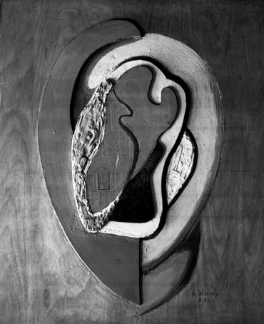 15 Holzrelief, o.T., 1932, Relief aus Sperrholz, Gips, Farbe mit Collage,