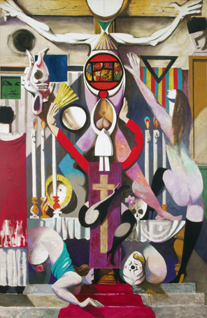 506 Schwarze Messe, November 1965, Öl mit Collage auf Hartfaser, 200 x 130 cm,