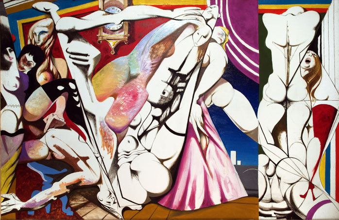 511 Unruhe im Salon, 1966, Öl auf Hartfaser, 130 x 200 cm, unsigniert, verso datiert