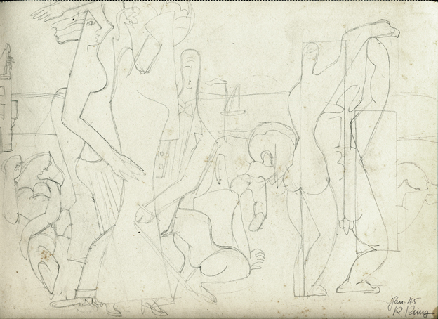 6 ohne Titel (Am Strand, ausgeführt, WV 80), 1945, Bleistift auf Papier, 22,6 x 31 cm sign. Jan.45 K.Kunz